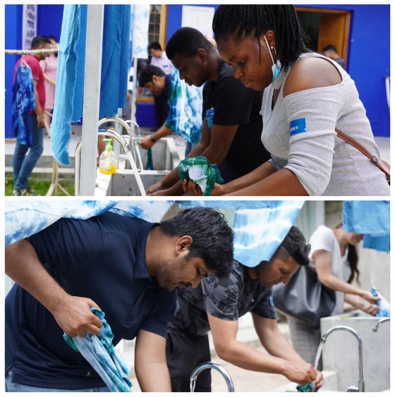 國(guó)際合作處副處長(zhǎng)田漢在活動(dòng)開場(chǎng)發(fā)言中,首先向在場(chǎng)的國(guó)際畢業(yè)生表示祝賀;希望參加活動(dòng)的外籍友人在科學(xué)島學(xué)習(xí)、工作之余,能夠多了解中國(guó)歷史文化、多接觸安徽傳統(tǒng)特色,并能在未來(lái)的科研生涯中取得良好的科研成就;希望大家通過(guò)多種形式向家人、朋友分享在科學(xué)島學(xué)習(xí)、工作和生活的所見所聞,在中國(guó)與各外籍友人所在國(guó)的文化和科技交流中,發(fā)揮好橋梁和紐帶的作用?;顒?dòng)通過(guò)報(bào)告的形式,直觀且生動(dòng)地介紹了扎染延續(xù)千年的歷史以及其染料的多樣性、環(huán)保性。隨后,外籍友人饒有興致的觀看了講解員對(duì)扎染的各個(gè)環(huán)節(jié)和步驟的詳細(xì)演示,并根據(jù)學(xué)習(xí)掌握的扎染技藝實(shí)地對(duì)織物進(jìn)行系綁、浸泡、取出、解綁、清洗并晾曬。由于扎結(jié)的方法不一,使得織物染色不均,每個(gè)人的織物呈現(xiàn)出了獨(dú)一無(wú)二的花紋。