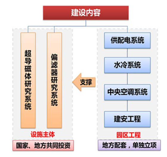設(shè)施主要建設(shè)內(nèi)容為超導(dǎo)磁體研究系統(tǒng)和偏濾器研究系統(tǒng)??傮w技術(shù)方案如下圖所示。超導(dǎo)磁體研究系統(tǒng)主要建設(shè)材料綜合性能研究平臺、導(dǎo)體性能研究平臺、磁體性能研究平臺、環(huán)向場磁體、中心螺管模型線圈磁體、高溫超導(dǎo)磁體、 低溫系統(tǒng)及電源系統(tǒng)。偏濾器研究系統(tǒng)主要建設(shè)偏濾器等離子體與材料相互作用研究平臺、偏濾器部件工程測試平臺、偏濾器原型部件、 全超導(dǎo)托卡馬克核聚變實(shí)驗(yàn)裝置下偏濾器、1/8真空室及總體安裝系統(tǒng)、負(fù)離子源中性束注入系統(tǒng)、電子共振加熱系統(tǒng)、高場低雜波電流驅(qū)動系統(tǒng)、離子回旋加熱系統(tǒng)、遙操作系統(tǒng)、總控系統(tǒng)等。
