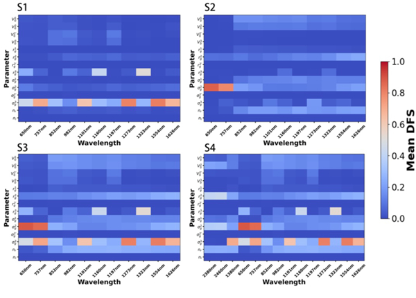 在觀測場景 S1–S4 下,各參數(shù)的平均 DFS 與波長 (650 nm–2460 nm) 的關系