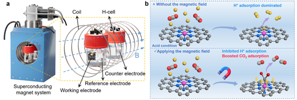 圖1. (a) 強磁場環(huán)境中CO2RR裝置示意圖;(b) 磁場增強 Ni?N5?C 催化劑上CO2RR的過程示意圖(其中 Ni 為玫瑰紅、N 為藍(lán)色、C 為灰色、O為紅色、H 為黃色)