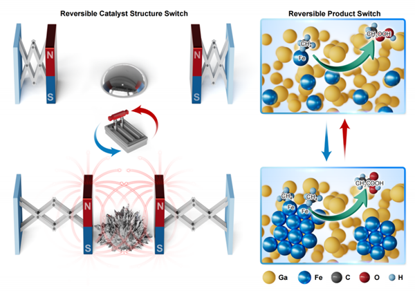 在該工作中,研究團隊設(shè)計和展示了一種鐵嵌入液態(tài)金屬催化劑(Fe–LMS)。這種Fe–LMS催化劑可響應(yīng)外部磁場強度的變化,實現(xiàn)了鐵原子在孤立單原子(Fe?-LMS)和聚集團簇(Fe?-LMS)之間的可逆快速重排。因此,實現(xiàn)了CH?氧化的主要液態(tài)產(chǎn)物CH?OOH和CH?COOH之間的可逆轉(zhuǎn)化,并在室溫下獲得了1679.6 mmol gFe?1 h?1和790.5 mmol gFe?1 h?1的高產(chǎn)率,以及99.9%和91.7%的高選擇性。通過ESR和MPMS、原位同步輻射光譜和理論計算,研究團隊發(fā)現(xiàn)磁場切換影響了Fe–LMS的納米結(jié)構(gòu)、局部配位環(huán)境和電子自旋,導(dǎo)致決定C1或C2反應(yīng)路徑的中間物種的產(chǎn)生。特別是,外磁場環(huán)境中鐵原子聚集態(tài)和電子自旋態(tài)的改變打破了與反應(yīng)分子的吸附能標(biāo)度關(guān)系,從而改變了反應(yīng)選擇性。該研究發(fā)表在Nature Nanotechnology上。中國科學(xué)技術(shù)大學(xué)吳宇恩教授、合肥工業(yè)大學(xué)鄭磊教授、中國科學(xué)院合肥物質(zhì)院強磁場中心胡林研究員及河南省科學(xué)院鐘文輝研究員為論文共同通訊作者。