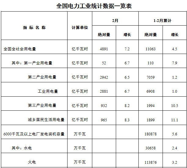 能源局發(fā)布1-2月份全國電力工業(yè)統(tǒng)計數(shù)據(jù) 6000千瓦及以上電廠發(fā)電裝機(jī)容量180878億千瓦時