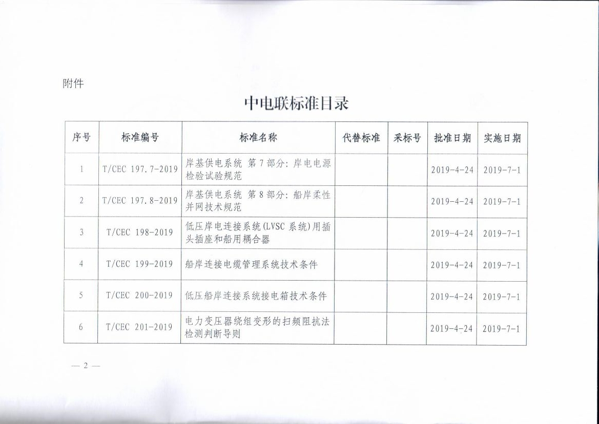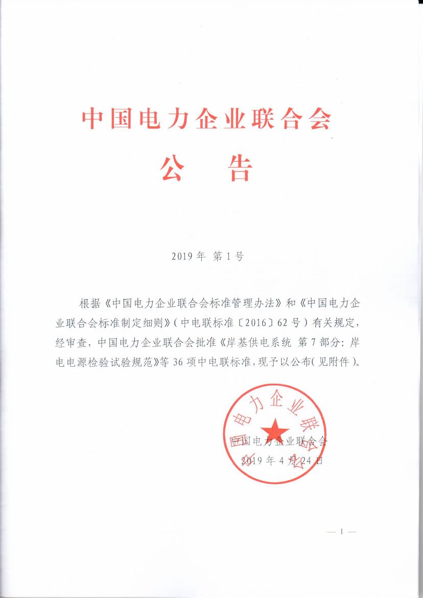 中國(guó)電力企業(yè)聯(lián)合會(huì)發(fā)布2019年第1號(hào)公告,批準(zhǔn)了岸基供電系統(tǒng)、特高壓、電動(dòng)汽車(chē)充電設(shè)施等36項(xiàng)電力行業(yè)標(biāo)準(zhǔn),具體名錄如下: