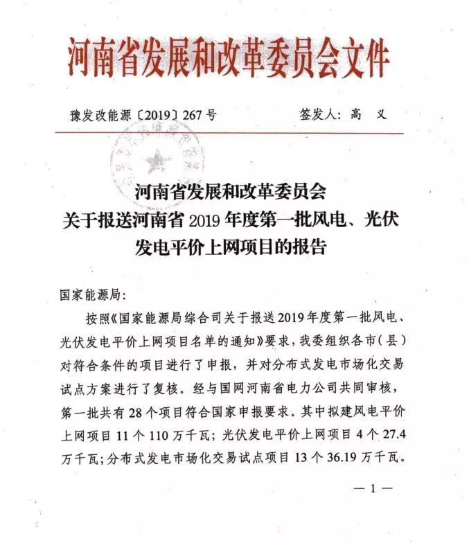 4月28日,河南省發(fā)改委向國(guó)家能源局報(bào)送了河南省2019年度第一批風(fēng)電、光伏發(fā)電平價(jià)上網(wǎng)項(xiàng)目報(bào)告。報(bào)告指出:經(jīng)與國(guó)網(wǎng)河南省電力公司共同審核,第一批共有28個(gè)項(xiàng)目符合國(guó)家申報(bào)要求。其中擬建風(fēng)電平價(jià)上網(wǎng)項(xiàng)目11個(gè),共計(jì)110萬千瓦;光伏發(fā)電平價(jià)上網(wǎng)項(xiàng)目4個(gè),共計(jì)27.4萬千瓦;分布式發(fā)電市場(chǎng)化交易試點(diǎn)項(xiàng)目13個(gè),共計(jì)36.19萬千瓦。