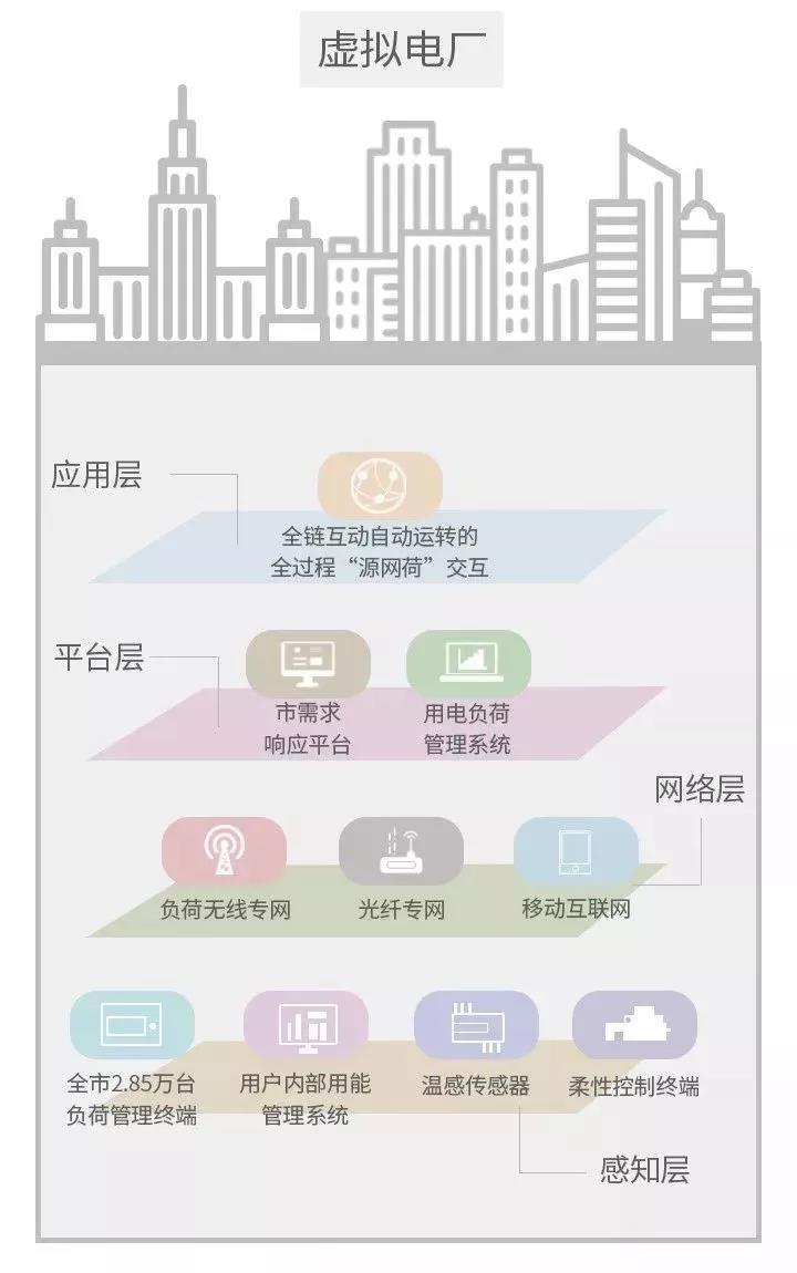 目前上海具備了比較完善的虛擬電廠建設(shè)條件,有著分布于全市10千伏及以上大客戶的負(fù)荷管理終端,在部分客戶內(nèi)部還有需求側(cè)管理系統(tǒng)、分項(xiàng)采集裝置和傳感器,這些共同構(gòu)建了泛在電力物聯(lián)網(wǎng)的感知層。