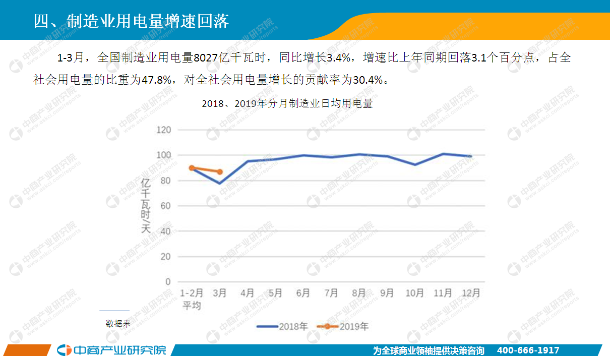 2019年1-3月,全社會用電增速同比提高,第二產業(yè)用電增速穩(wěn)中有升;全國工業(yè)和制造業(yè)用電量同比增長,但增速均低于全社會用電量;四大高載能行業(yè)用電增速總體放緩,有色金屬冶煉行業(yè)當月用電量有所降低;火電和風電發(fā)電量增速同比降低,水電和核電發(fā)電量增速同比提高;全國發(fā)電設備利用小時與上年基本持平,水電發(fā)電設備利用小時同比持續(xù)增加;全國跨區(qū)、跨省送電保持較快增長;全國基建新增裝機容量同比持續(xù)減少,其中太陽能發(fā)電新增裝機減少較多;電源和電網完成投資同比持續(xù)下降,但清潔能源投資占比有所提高。