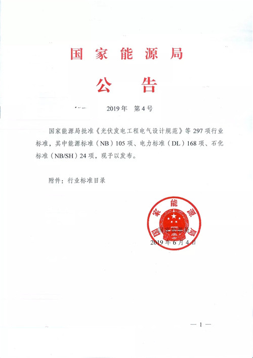 國(guó)家能源局發(fā)布公告,批準(zhǔn)《光伏發(fā)電工程電氣設(shè)計(jì)規(guī)范》等297項(xiàng)行業(yè)標(biāo)準(zhǔn),其中能源標(biāo)準(zhǔn)(NB)105項(xiàng)、電力標(biāo)準(zhǔn)(DL)168項(xiàng)、石化標(biāo)準(zhǔn)(BN/SH)24項(xiàng)。