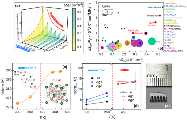 為解決這一難題,研究團隊研發(fā)了一種新型高密度Ag2Te1-xSx材料。研究表明,在僅70 MPa的中等驅動壓力下,該材料實現了0.478 J·cm-3·K-1的可逆體積熵變,刷新了當前無機壓卡材料的最高紀錄。其壓卡強度高達6.82 mJ·cm-3·K-1·MPa-1,不僅遠超多數已報道的無機壓卡材料,甚至優(yōu)于新戊二醇等經典的有機龐壓卡材料。進一步研究表明,該材料巨大的體積壓卡效應源于壓力誘導的立方相至單斜相結構轉變(相變時晶格體積變化約為5.4%),以及相變過程中銀離子擴散動力學的顯著變化。值得一提的是,該材料體系還具備較高熱導率(2.02–2.28 W·m-1·K-1),有助于實現高效熱交換,進而提升制冷效率;同時,還顯示出良好塑性,可輕松加工成1毫米級小球或0.5毫米以下薄片;更重要的是,經過劇烈塑性變形、熱沖擊循環(huán)及反復壓力加載/卸載后,壓卡性能仍保持穩(wěn)定,顯示出優(yōu)異的服役可靠性。