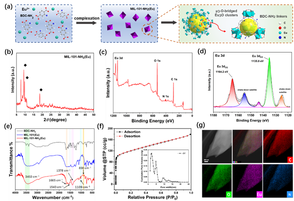鑒于此,研究團隊通過一步水熱合成策略,成功制備出具有內(nèi)在雙色熒光特性的MIL-101-NH2(Eu)金屬有機框架(MOF)材料,不僅有效避免了環(huán)境和其他有機溶劑的干擾,而且還可以觀察到痕量水引發(fā)的熒光顏色變化,從而實現(xiàn)可視化檢測。通過將鑭系金屬離子和 BDC-NH2作為前驅(qū)體材料引入MOFs結(jié)構(gòu)中,鑭系金屬離子(Eu3+)的特征紅熒光可以通過天線效應(yīng)得到增強。配體-水結(jié)構(gòu)有利于激發(fā)態(tài)下從給體單元到受體單元的分子內(nèi)電荷轉(zhuǎn)移,削弱天線效應(yīng),從而顯示出配體的藍色熒光。因此,所制備的熒光傳感體系展現(xiàn)出較低的檢測限。在此基礎(chǔ)上,將該MOF材料與羧甲基纖維素相結(jié)合,通過原位生長方式構(gòu)筑了一種高性能MOFs@纖維素納米纖維膜傳感器。該傳感器在水分檢測中表現(xiàn)出高靈敏度、可視化熒光檢測與快速響應(yīng)能力,展現(xiàn)出廣泛的應(yīng)用前景。