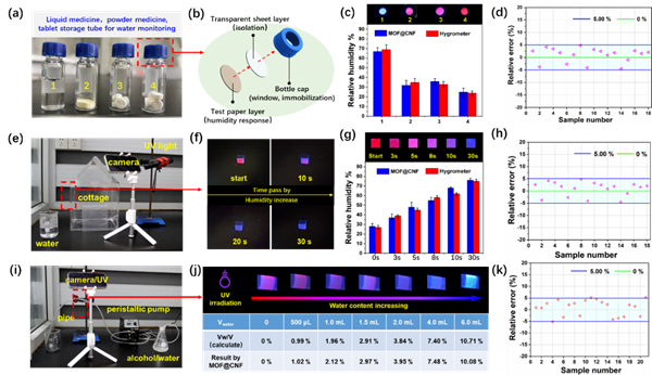 圖2. MOFs@纖維素?zé)晒饽ぴ诠腆w藥物儲存、室內(nèi)濕度監(jiān)測及管道運輸中的應(yīng)用展示