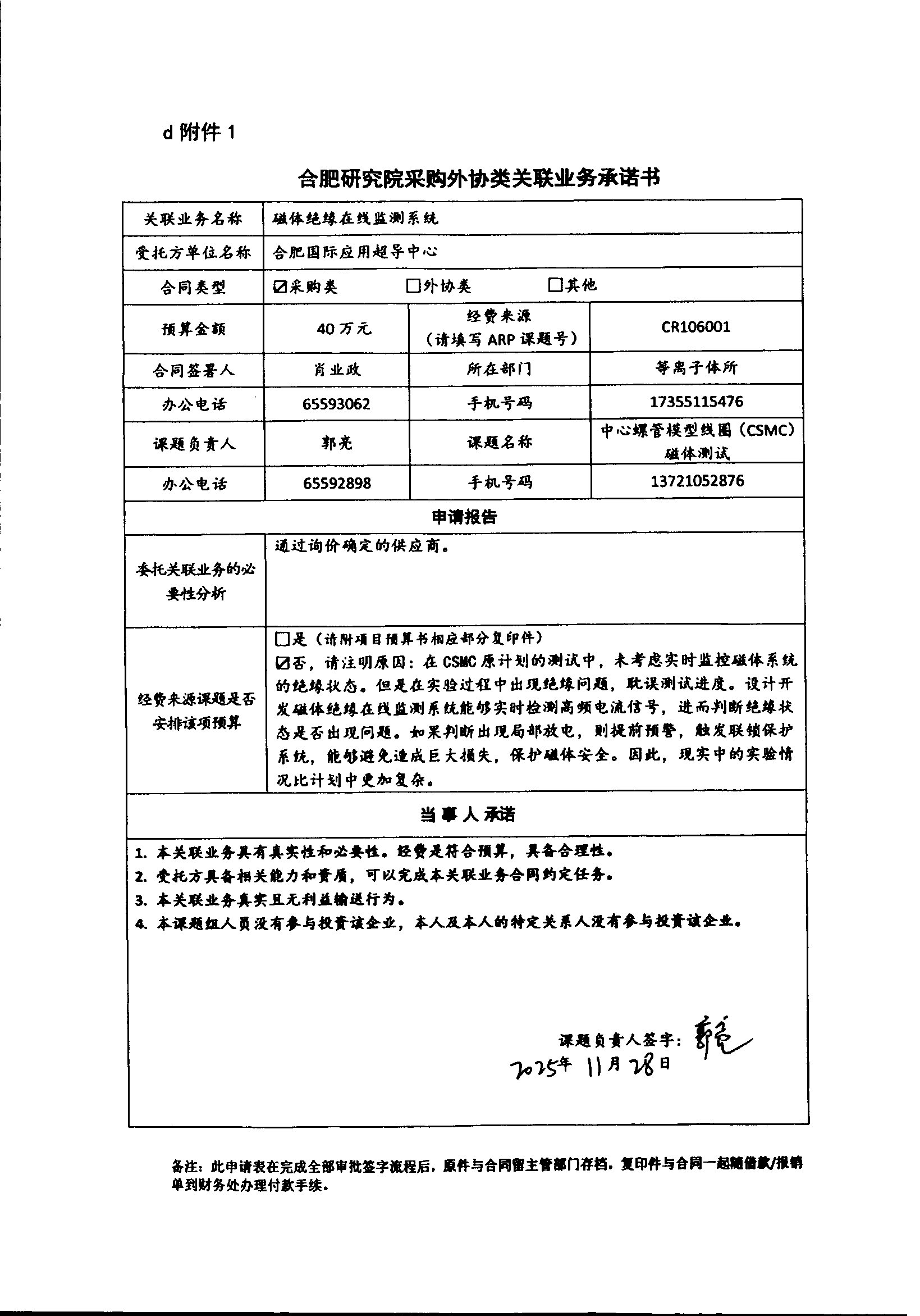 根據(jù)《中國科學院關(guān)于加強科研項目關(guān)聯(lián)業(yè)務管理的暫行規(guī)定》(科發(fā)條財字〔2015〕125號)、《中國科學院合肥物質(zhì)科學研究院關(guān)于加強科研項目關(guān)聯(lián)業(yè)務管理的實施細則》(科合院發(fā)資字〔2021〕8號)、《合肥研究院加強關(guān)聯(lián)業(yè)務管理暫行辦法》(科合院發(fā)資字〔2022〕1號)、《合肥物質(zhì)院加強關(guān)聯(lián)業(yè)務管理補充規(guī)定》(科合院發(fā)資字〔2025〕1號)要求,現(xiàn)就我院委托合肥國際應用超導中心進行磁體絕緣在線監(jiān)測系統(tǒng)設計開發(fā)做關(guān)聯(lián)業(yè)務公示。