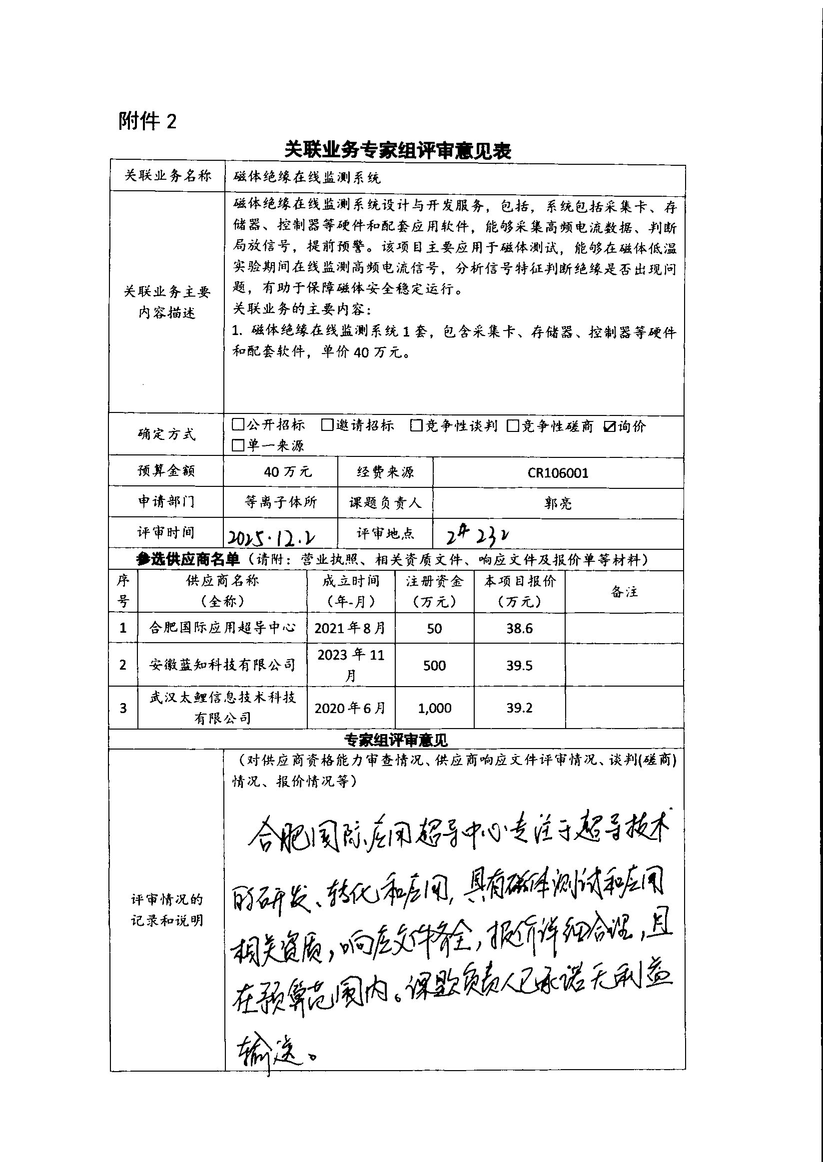 ??磁體絕緣在線監(jiān)測系統(tǒng)1套,包含采集卡、存儲器、控制器等,價格38.6萬元。