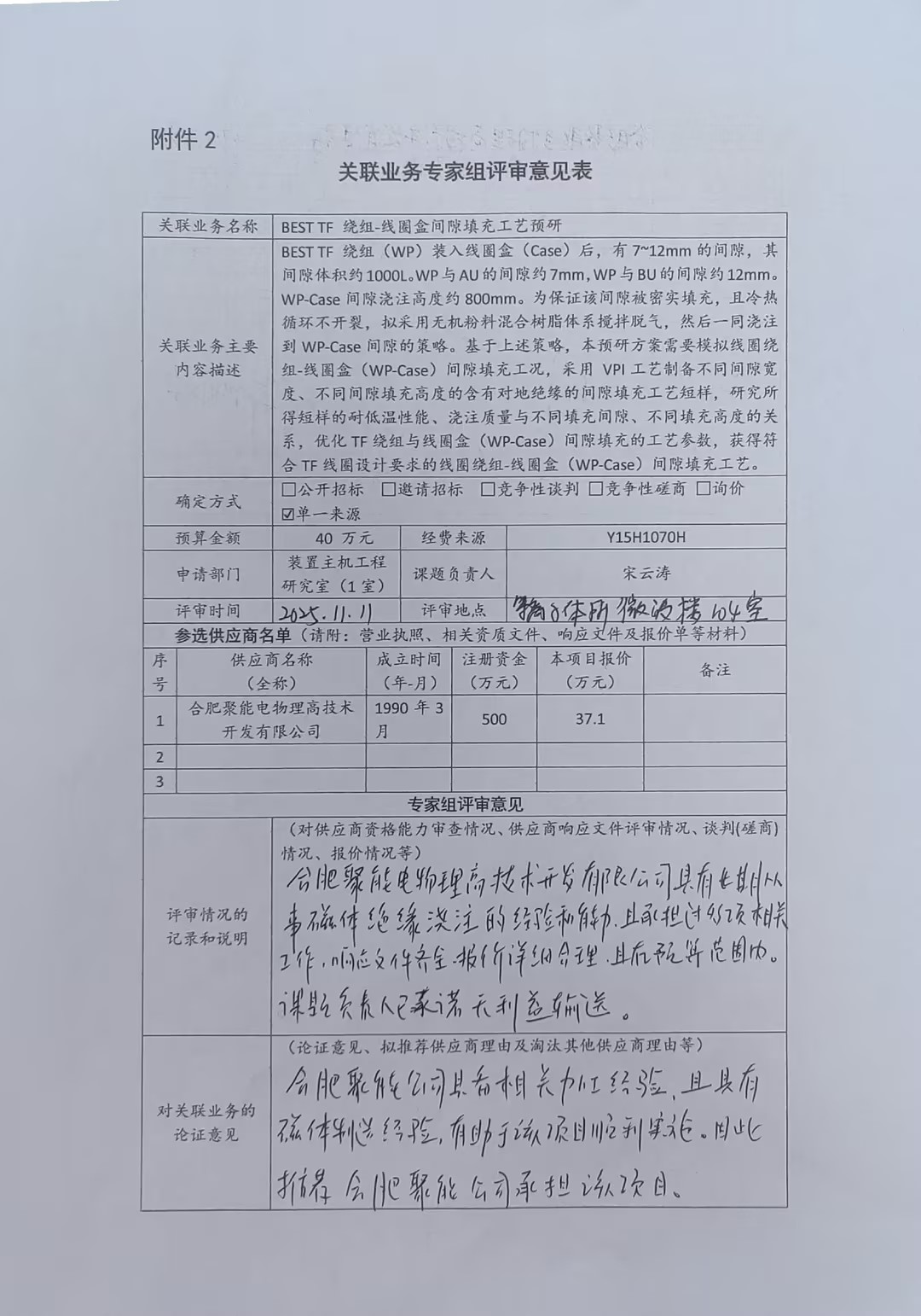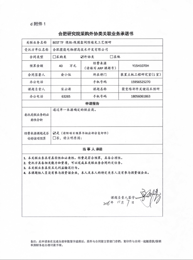 根據《中國科學院關于加強科研項目關聯業(yè)務管理的暫行規(guī)定》(科發(fā)條財字〔2015〕125號)、《中國科學院合肥物質科學研究院關于加強科研項目關聯業(yè)務管理的實施細則》(科合院發(fā)資字〔2021〕8號)、《合肥研究院加強關聯業(yè)務管理暫行辦法》(科合院發(fā)資字〔2022〕?1號)、《合肥物質院加強關聯業(yè)務管理補充規(guī)定》(科合院發(fā)資字〔2025〕1號)要求,現就我院委托合肥聚能電物理高技術開發(fā)有限公司進行BEST?TF繞組-線圈盒間隙填充工藝預研的關聯業(yè)務做公示。