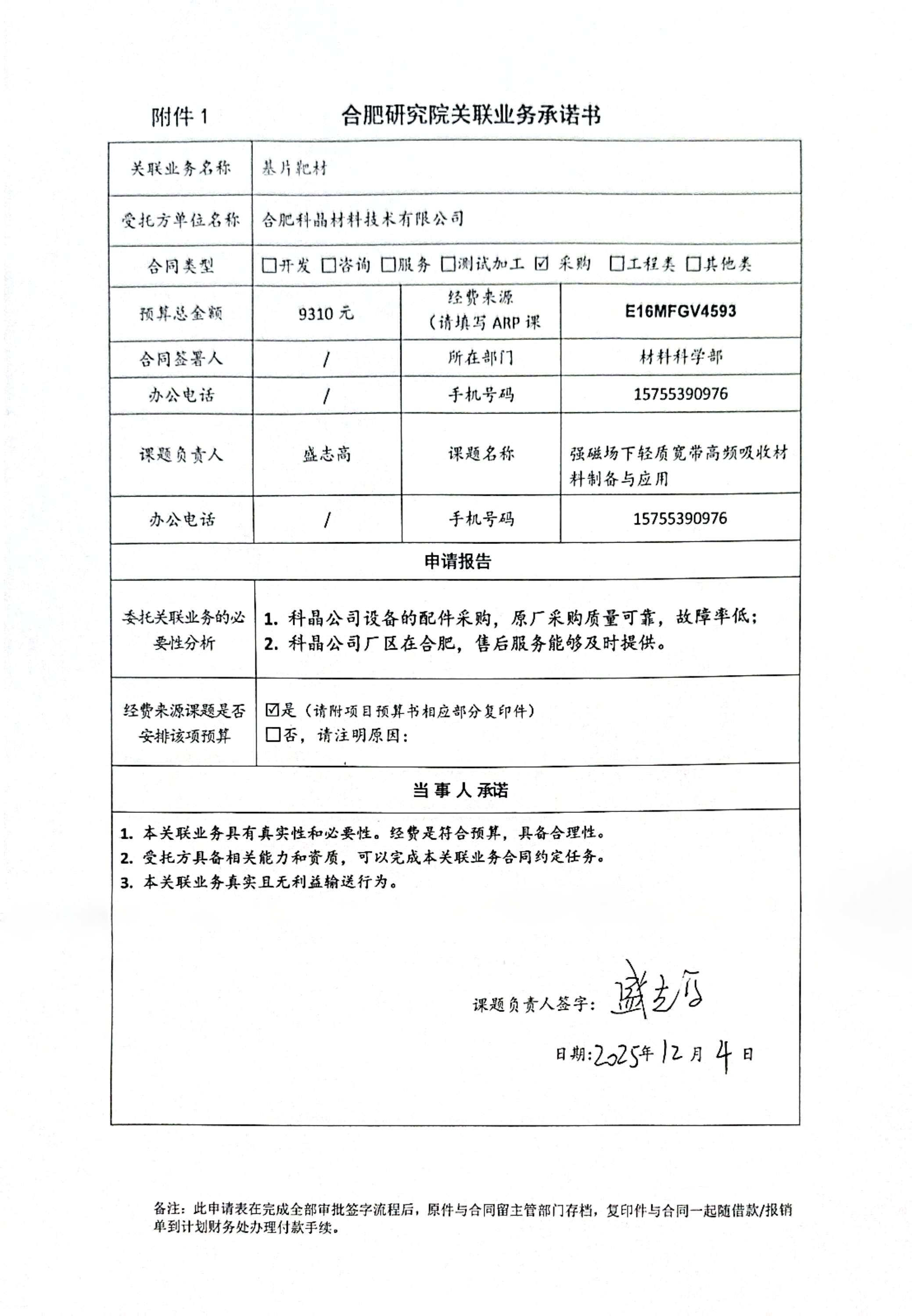 根據(jù)《中國科學(xué)院關(guān)于加強(qiáng)科研項(xiàng)目關(guān)聯(lián)業(yè)務(wù)管理的暫行規(guī)定》(科發(fā)條財(cái)字〔2015〕125號(hào))、《中國科學(xué)院合肥物質(zhì)科學(xué)研究院關(guān)于加強(qiáng)科研項(xiàng)目關(guān)聯(lián)業(yè)務(wù)管理的實(shí)施細(xì)則》(科合院發(fā)資字〔2021〕8號(hào))、《合肥研究院加強(qiáng)關(guān)聯(lián)業(yè)務(wù)管理暫行辦法》(科合院發(fā)資字〔2022〕1號(hào))、《合肥物質(zhì)院加強(qiáng)關(guān)聯(lián)業(yè)務(wù)管理補(bǔ)充規(guī)定》(科合院發(fā)資字〔2025〕1號(hào))要求,現(xiàn)就我院從合肥科晶材料技術(shù)有限公司采購基片靶材做關(guān)聯(lián)業(yè)務(wù)公示。