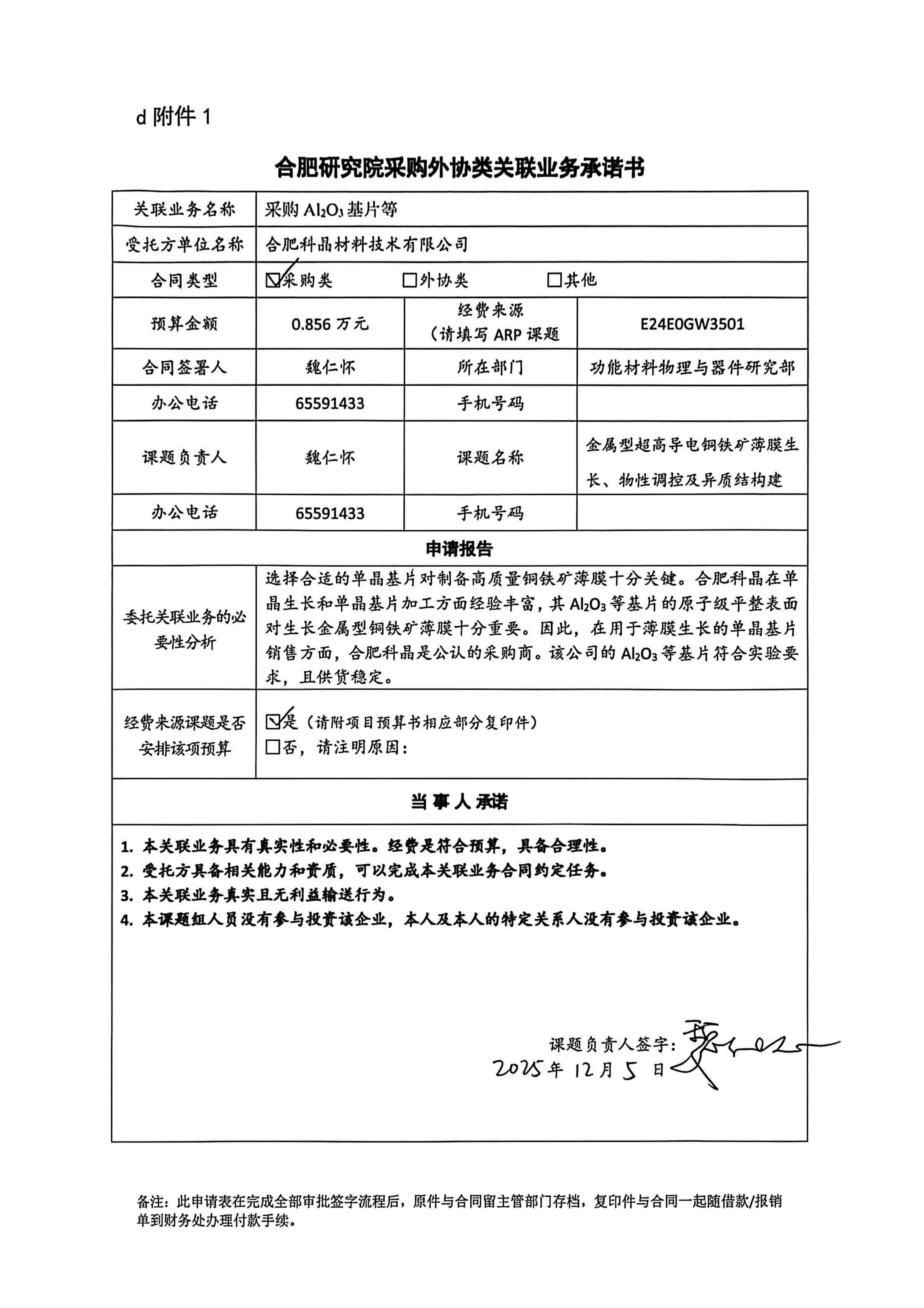 根據(jù)《中國科學院關于加強科研項目關聯(lián)業(yè)務管理的暫行規(guī)定》(科發(fā)條財字〔2015〕125號)、《中國科學院合肥物質(zhì)科學研究院關于加強科研項目關聯(lián)業(yè)務管理的實施細則》(科合院發(fā)資字〔2021〕8號)、《合肥研究院加強關聯(lián)業(yè)務管理暫行辦法》(科合院發(fā)資字〔2022〕1號)、《合肥物質(zhì)院加強關聯(lián)業(yè)務管理補充規(guī)定》(科合院發(fā)資字〔2025〕1號)要求,現(xiàn)就我院從合肥科晶材料技術有限公司購買Al2O3等基片做關聯(lián)業(yè)務公示。